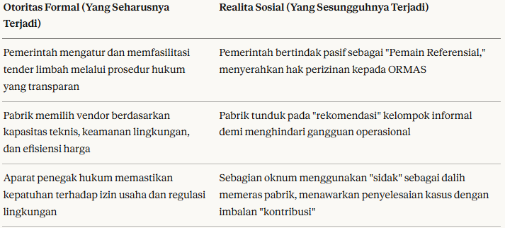 - Intervensi Tender: Ketika pabrik membuka lelang kontrak pengelolaan limbah, pemenang hampir tidak pernah ditentukan oleh efisiensi teknis. Kontrak dikoordinasikan melalui tekanan ORMAS yang akhirnya memengaruhi pilihan manajemen pabrik dalam menentukan kebijakan pengolahan atau pengelolaan limbah mereka.